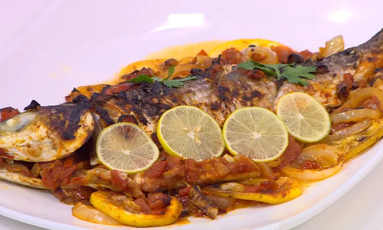 ![]() أكلات اليوم التاسع والعشرون من رمضان ![]() سمك سنجاري ![]() ![]() كيلو ونصف جرام سمك لوت أو قاروص أو بوري 2 حبة بطاطس 2 حبة بصل متوسطة 3 فروع كرفس مفروم 3 فروع كسبرة مفرومة 5 فصوص ثوم شرائح 1 حبة طماطم كبيرة مكعبات 1 حبة فلفل أخضر حار قطع صغيرة (حسب الرغبة) 1/2 كوب عصير ليمون 2 ورق لاورا 2 ملعقة صغيرة بهارات السمك 3/4 كوب زيت زيتون ملح وفلفل ![]() - تنظف السمكة وتغسل جيدًا ويشق ظهرها وتفتح حتى تكون السمكة قطعة واحدة مسطحة. - يقطع البصل مربعات صغيرة، ويخلط البصل مع الكرفس والكسبرة وشرائح الثوم والطماطم والفلفل الحار وعصير الليمون وورق اللورا وبهارات السمك والملح والفلفل و1/2 كوب من الزيت، وتقلب المكونات جيدًا في وعاء. - تدهن صينية للفرن بالزيت وتوضع السمكة في الصينية بحيث يكون جلد السمكة على قعر الصينية، وتضاف 3/4 كمية الخضروات فوق لحم السمكة. - تقشر البطاطس وتقطع مكعبات وتخلط البطاطس مع بقية كمية الخضروات وباقي الزيت وتنثر حول السمكة في الصينية، ويمكن إضافة القليل من الزيت على السطح. - يحمى الفرن إلى درجة حرارة 200-220 مئوية، وتوضع صينية السمك في الفرن لمدة 30-40 دقيقة حتى تنضج السمكة وتقدم. طاجن جمبري بالفرن ![]() ![]()